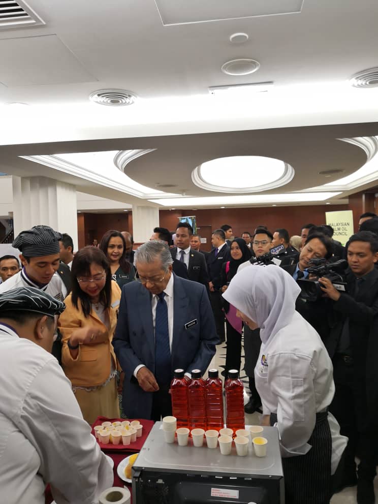 Primary Industries Minister Teresa Kok Suh Sim and Prime Minister Tun Dr Mahathir Mohamad takes a closer look at cooking oils and dessert made with palm shortening at the “Love My Palm Oil” campaign held at the Parliament lobby.