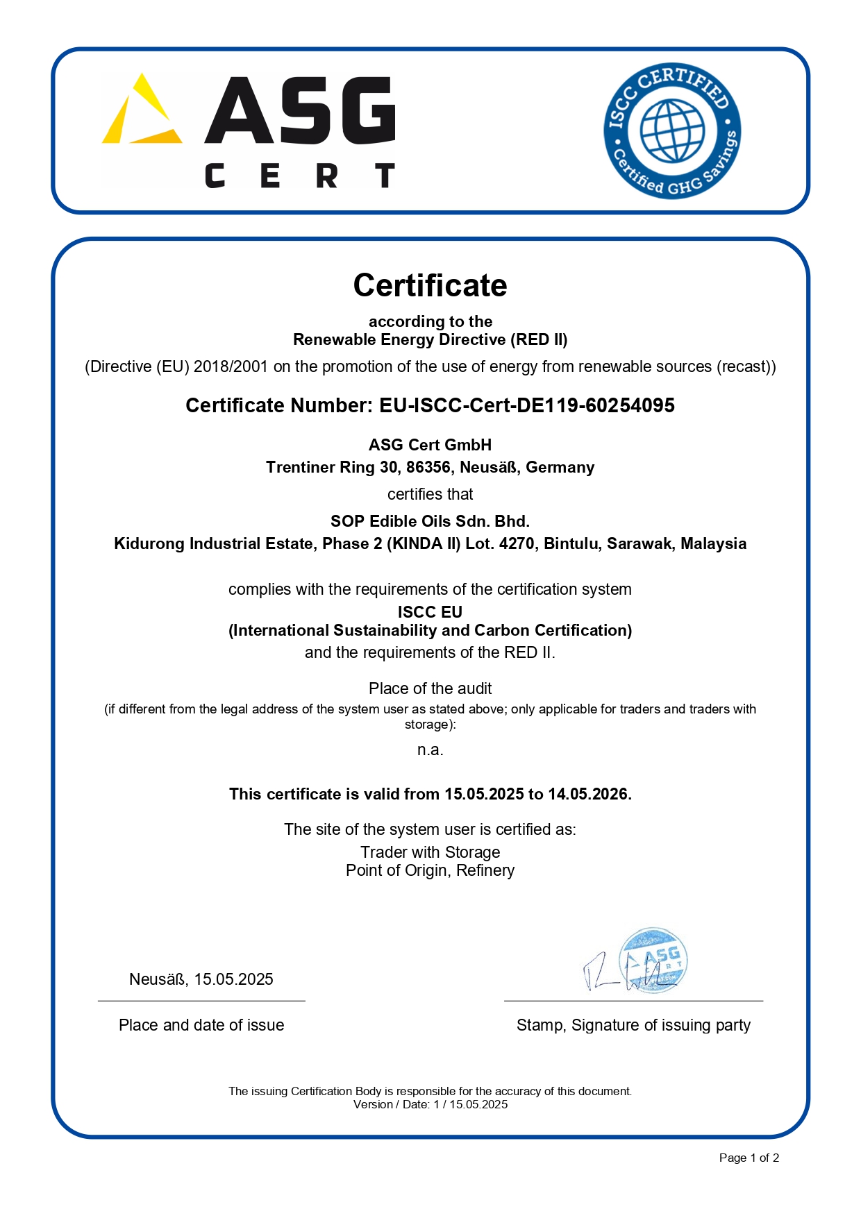 The Group commits to an international certification known as ISCC which was created through an open multi-stakeholder approach that guides a certified entity to focus on producing sustainable raw materials and products, promote traceability within the supply chain and as well as reducing the greenhouse gases emissions. The ISCC certification was developed in accordance to the legal requirements stipulated in Renewable Energy Directive 2009/28/EC and Fuel Quality Directive 2009/30/EC and it is seen as a reliable certification system that helps customers to recognize the difference between sustainable and non-sustainable biofuels.
